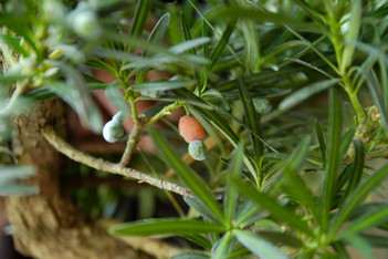 Native to South-Eastern China and Southern Japan the Buddhist Pine grows in open thickets in the forest and is found between sea level and 1000 meters. A conifer, it has flat leaf-like needles and an exposed seed on a 2 scale pine. The scales turn pulpy and red and are eaten by birds which then disperse the seeds around. It is revered in Japanese and Chinese Buddist temples from where it gets one of its common names.